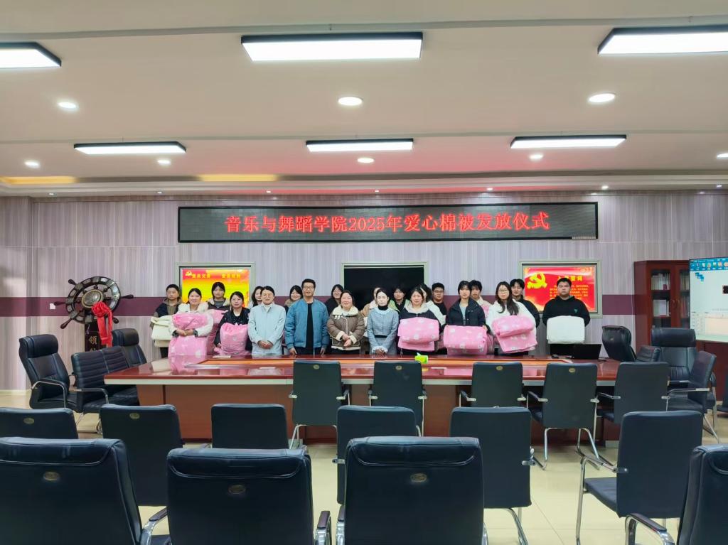 11月25日下午,音乐与舞蹈学院“寒冬暖人心”棉被发放仪式在艺术楼三楼会议室举行,学院党委副书记雷玲,辅导员曹阳,杨文倩,李佳旭,邹轶卿,肖一凡老师和30名学生代表参加发放仪式。