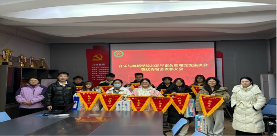 为全方位引导学生养成良好习惯、强化宿舍凝聚力,营造积极向上、奋发有为的校园氛围,我院于 12 月 27 日在艺术楼三楼会议室隆重召开了宿舍管理交流座谈会暨优秀宿舍表彰大会。出席本次活动的有学院团委书记李佳旭老师、思想政治教育与就业指导教研室主任杨文倩老师、专职辅导员邹轶卿老师,以及音乐与舞蹈学院全体宿舍长。